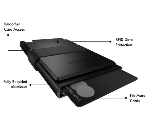 The Aluminum Cardholder Pro holds up to 14 cards and bills. Customize your wallet with our modular add-ons that expand storage space without adding bulk.